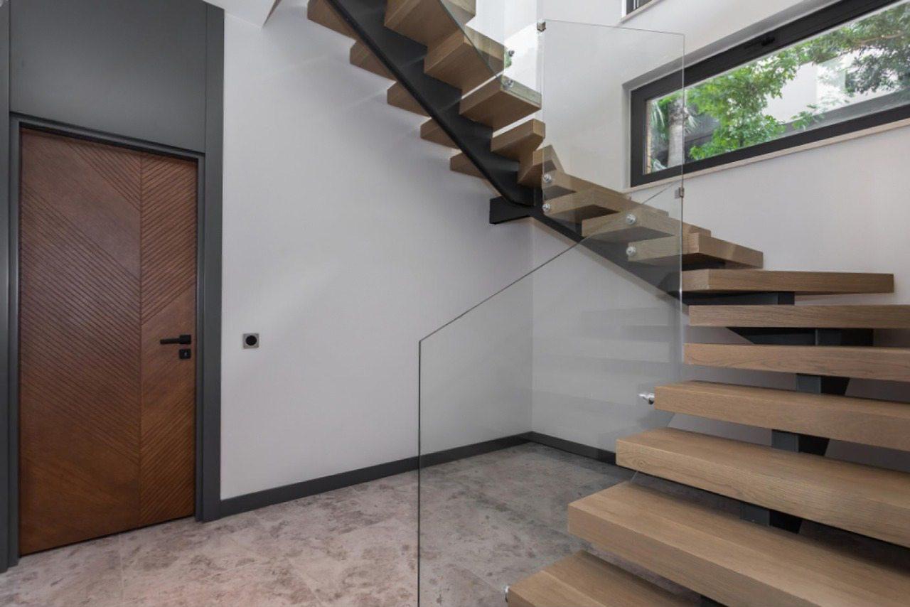 Визуальная легкость. За счет центральной балки и отсутствия подступенков конструкция выглядит «воздушной», не утяжеляет интерьер и пропускает максимум естественного света.